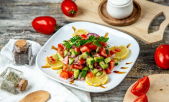 огурцы; помидоры; сладкий перец; красный лук; оливковое масло; лимонный сок; соль; черный перец;