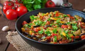 баклажаны; кабачки; помидоры; лук; морковь; сельдерей; оливковое масло; соль; перец; паприка;