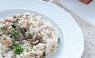 рис арборио; куриное филе; белые грибы; куриный бульон; лук; чеснок; оливковое масло; белое вино; сыр пармезан; соль; перец; петрушка;