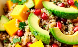Киноа; Вода; Манго; Черри помидоры; Шпинат; Авокадо; Оливковое масло; Сок лайма; Соль; Перец;