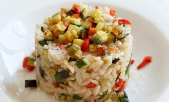 ризотовый рис; помидоры; болгарский перец; морковь; цукини; оливковое масло; соль; перец чёрный молотый; зелень;