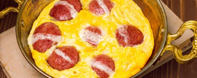 Приготовьте быструю и вкусную фриттату с яйцами, колбасой и овощами! Идеальный завтрак для занятых людей и любителей сытных блюд. Подайте горячей и наслаждайтесь ароматом!